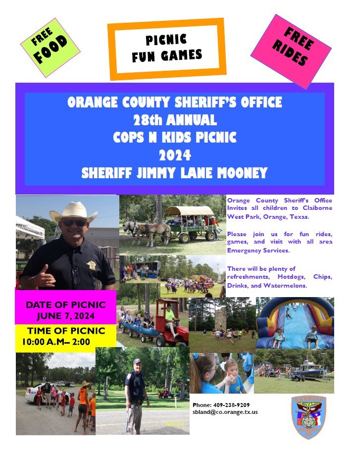 The Orange County Sheriff’s Office 28th Annual Cops and Kids Picnic is scheduled for June 7, 2024, from 10 AM – 2 PM at Claiborne West Park, located off of Interstate 10 12 miles west of Orange.