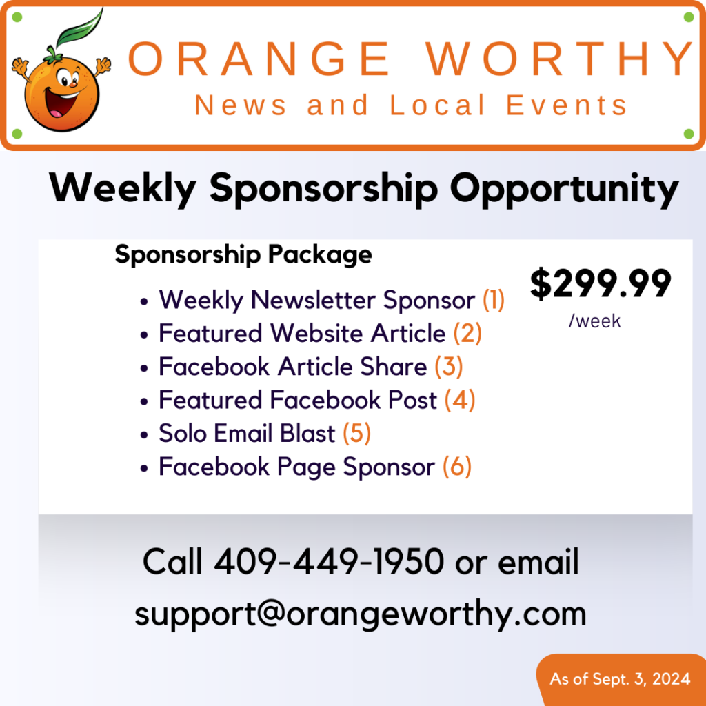Own a local business? You can help by becoming a sponsor – we help by bringing exposure to your business and increasing your clients and you help us continue to bring news and events to the Orange, TX area.