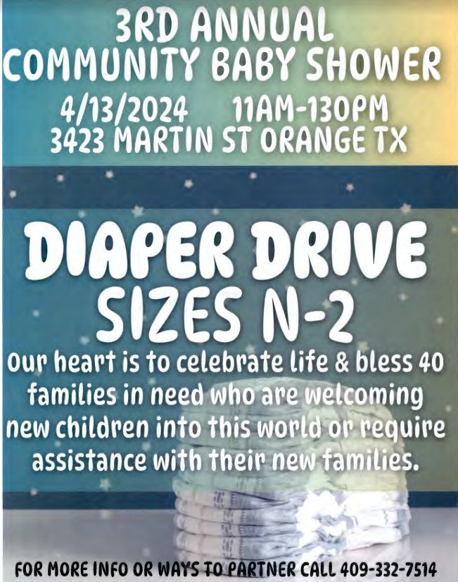 Destiny Church will be sponsoring the 3rd Annual Community Baby Shower on April 13, 2024, from 11 AM – 1:30 PM at Destiny Church, located at 3423 Martin St. in Orange.