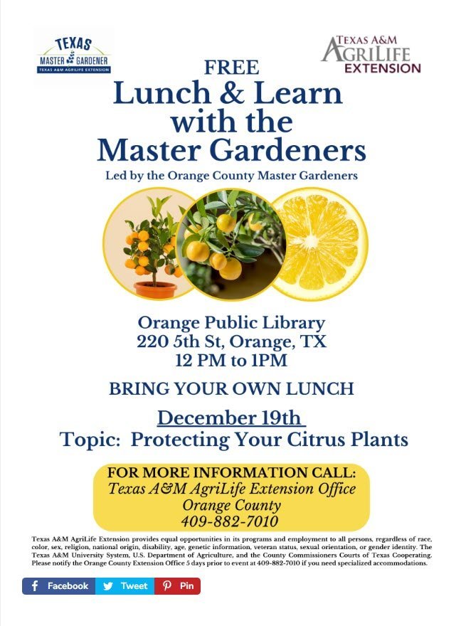 The Texas A&M AgriLife Extension Office is offering a free Lunch and Learn with Master Gardeners program at the Orange Public Library, located at 202 5th St. in Orange from noon – 1 PM on December 19.  All participants are asked to bring their lunches.